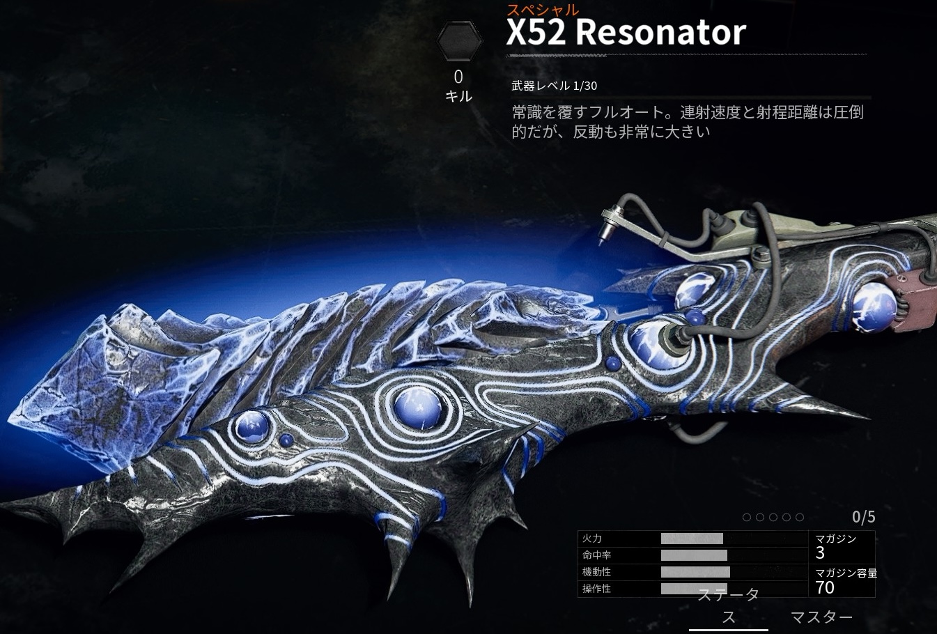 500rpm | 34/29/29/29/29/29/29/29 31/26/26/26/26/26/26/26 26/22/22/22/22/22/22/22 | 310m/s | 最大:9.5m 9.6m〜19.7m 最小:19.8m | 30発/ 30発 | 3〜4発 4発 4〜5発 | 0.360秒 | プレイヤー レベル40 |
