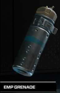 未来系CODに度々登場するEMPグレネードで、EMPとは電磁パルス(electromagnetic pulse)の略称で、電子兵器にダメージを与えることができます。基本的に相手の装備やストリークに有効で、当たると一時的に装備を停止させたり破壊することができます。自動攻撃系のストリークには特に有効で、地上で歩いている兵器はこれ一つで止めることができます。