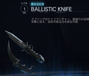 山なりに飛びますが、地面と平行に撃っても45m辺りまでは飛ぶので、リーサルのトマホークとは少し感覚が異なります。弾数は少ないですが3発入っており、1発撃つと長めのリロードが入ります。刃自体は回収できるので、外れてもしっかり回収できれば弾切れの心配はないです。勿論、近接攻撃ボタンでナイフ攻撃もしっかりできるので、ボタン操作に気を付けながら使いたいです。
