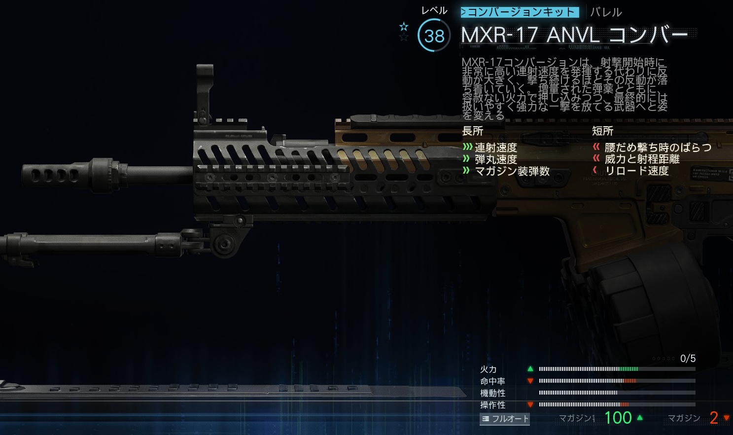 | 最大ダメージ範囲 ダメージ – – ダメージ – 33 32 ⇩ 範囲 – – 範囲 – 0~33m 0~33m 中程度のダメージ範囲 ダメージ – – ダメージ – 31 31 範囲 – – 範囲 – 33.1 – 52.1m 33.1 – 52.1m 最小ダメージ範囲 ダメージ – – ダメージ – 24 24 範囲 – – 範囲 – 52.1m以上 52.1m以上 MXR-17の調整 ・首と上半身の倍率が1.1倍になりました。(ANVL変換には適用されません) ANVL変換調整 ・最終(最も遅い)発射速度は、333RPMから400RPMに向上しました。 ・最終的な発射速度に達するまでに必要な弾丸の数は、18発から25発に増加した。 ・発射速度が初期値に完全にリセットされるまでの時間が、370msから240msに短縮されました。 |