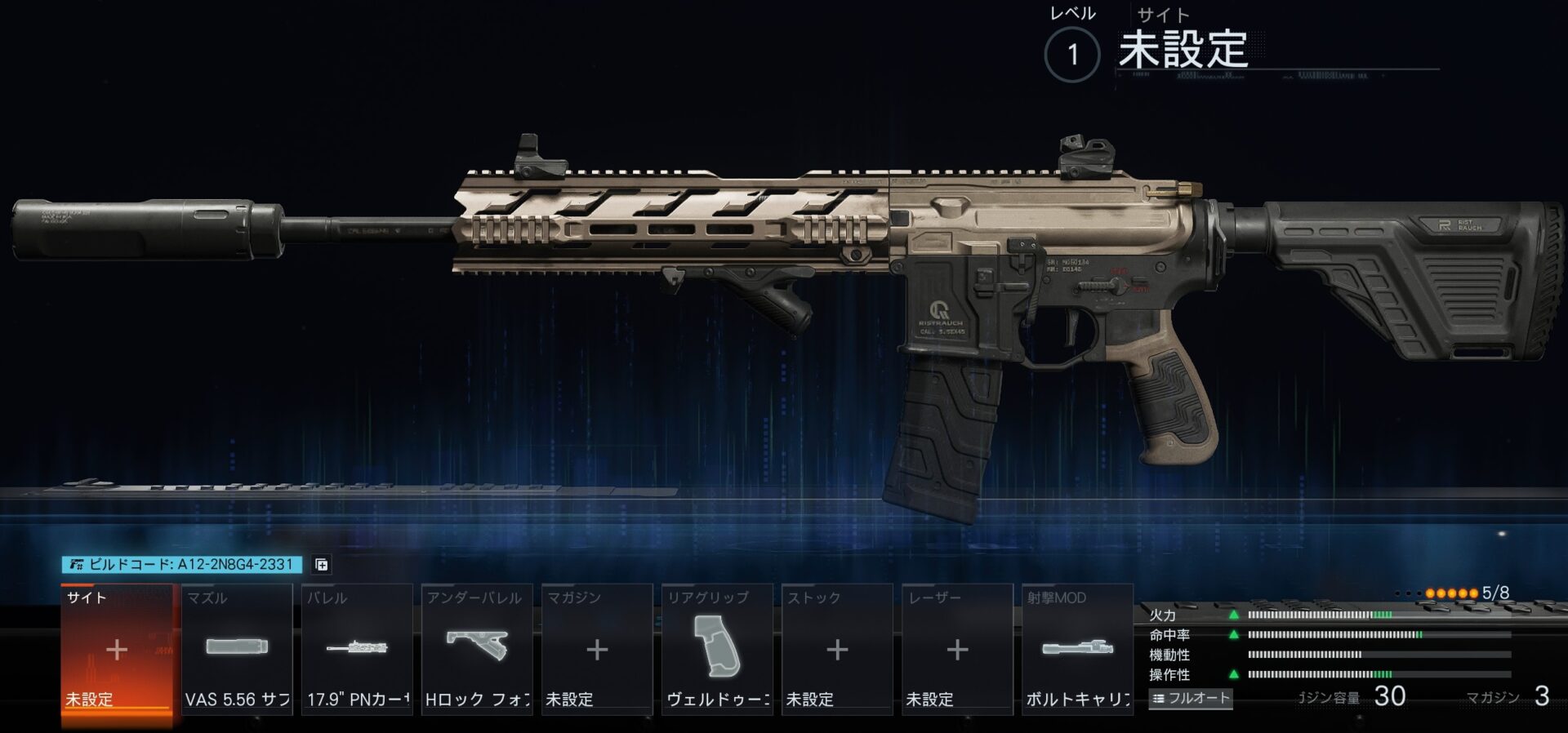 ベータ版でも初期から使用でた安定系アサルトライフル(AR)です。反動は右に少しだけ膨らみながら左に行くので、水平反動を抑えればかなり扱いやすくなります。AR内では連射力が2番目に早いので近距離戦でも戦いやすいです。プレステージアタッチメントはFMJ弾、発砲音が消える優秀なものなので是非手に入れたいです。